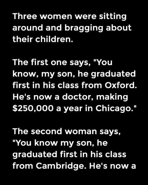Three women were sitting around and bragging about their children. The first one says, “You know, my son, he graduated…