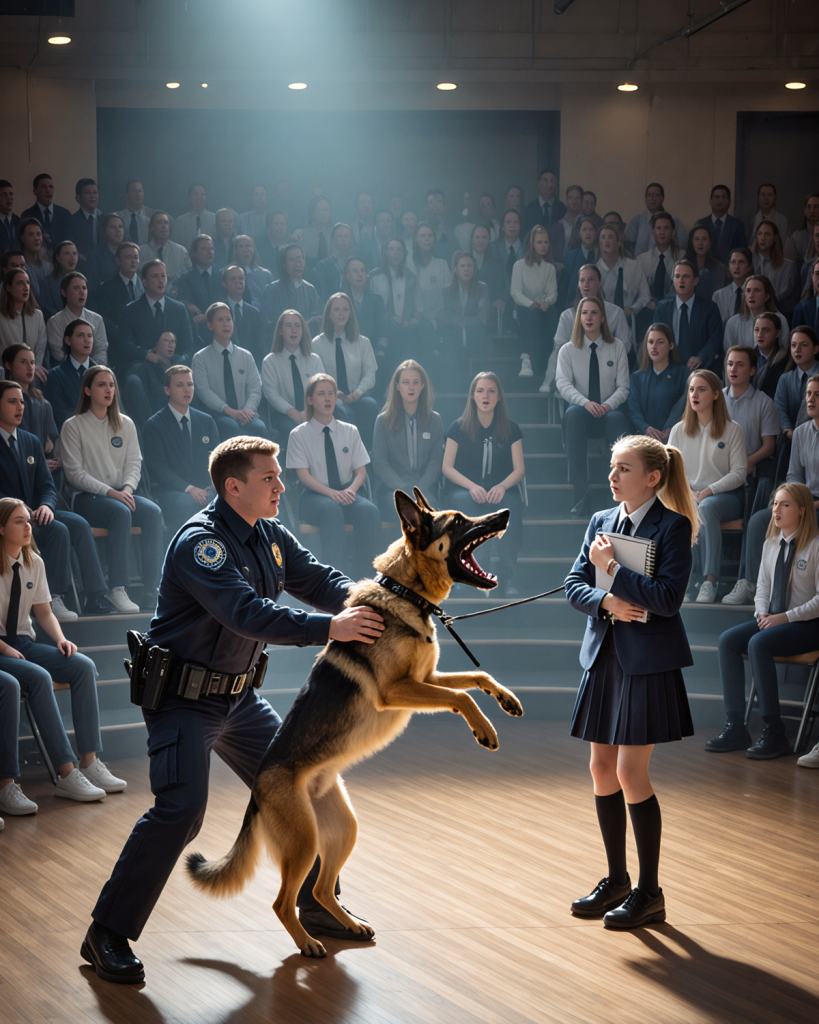 She screamed as the notebook flew from her hands, and chaos erupted in the auditorium. Teachers rushed forward, trying to pull the dog away.