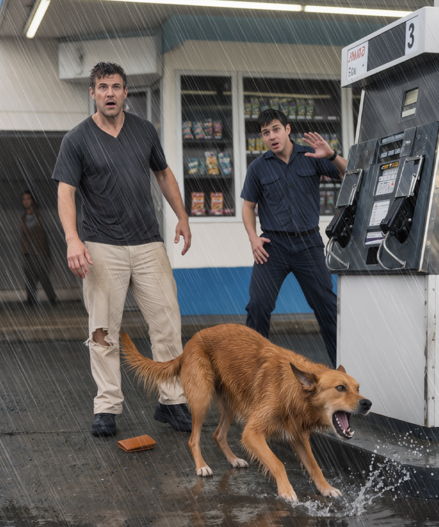 Dogs wandered through now and then, drawn by the smell of leftover food tossed near the dumpsters. But when they looked outside, this one was different. A reddish-brown dog stood squarely in front of Pump #3, rain dripping off his fur, eyes burning with something more than hunger.