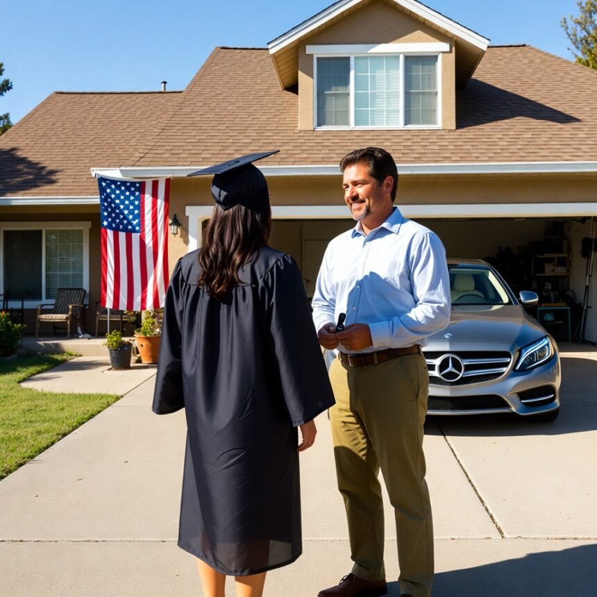 “Take the bus. We’re buying your sister a Mercedes,” my father said on the morning of graduation. I hugged my gown and stood quietly at the bus stop outside the arena. But when I walked on stage, the dean suddenly added a title that made the whole crowd jump to their feet—and my father went pale. Then by the fountain, he grabbed me and demanded something… I just smiled.