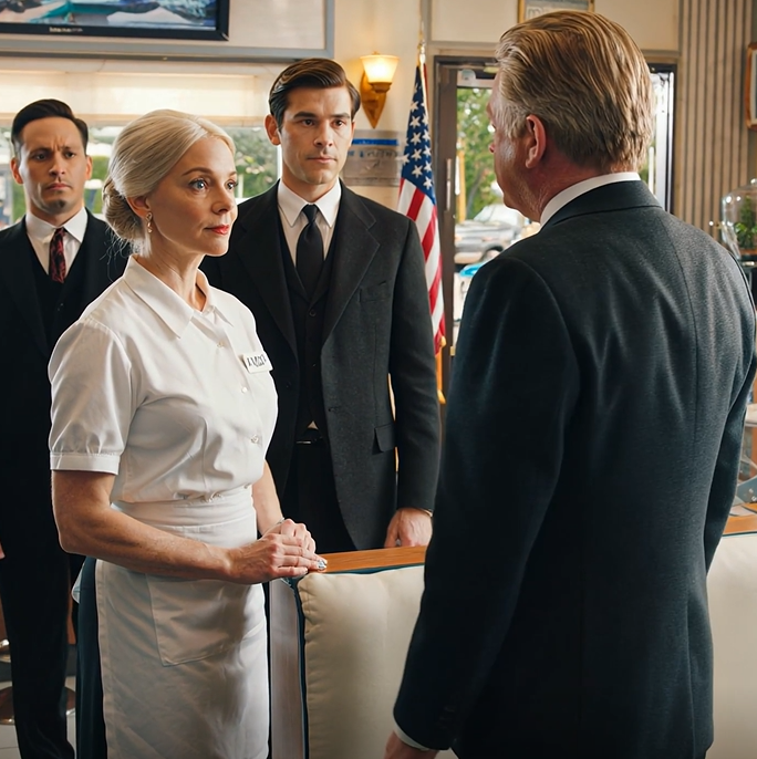 After my own children turned away from me, I started working as a waitress at sixty and made a quiet habit of sharing my lunch with an elderly man who always sat alone—until one afternoon my son walked in with a smile that did not belong in that moment and spoke in a way that made the room fall silent, just as four well-dressed men stepped inside and the elderly man rose to his feet, fixed his eyes on my son, and spoke with a calm authority that shifted THE ENTIRE ATMOSPHERE.
