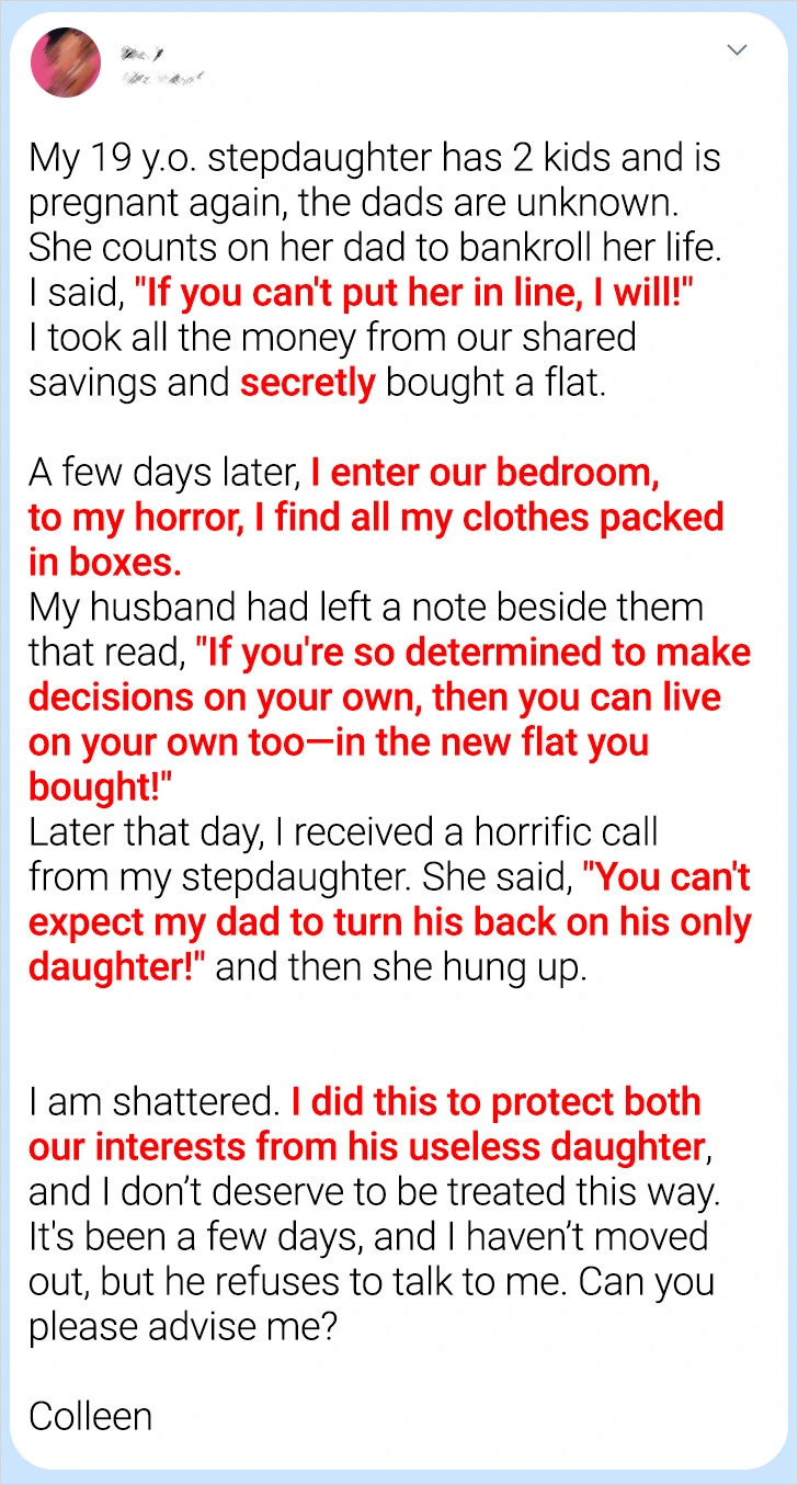 In blended families, it’s typical for caregivers to have varying opinions on child-rearing. Colleen’s spouse continues to offer financial assistance to his 19-year-old daughter, who is expecting a baby and already has two children. On the other hand, Colleen believes that her stepdaughter should not be pampered and must learn to be accountable for her choices.