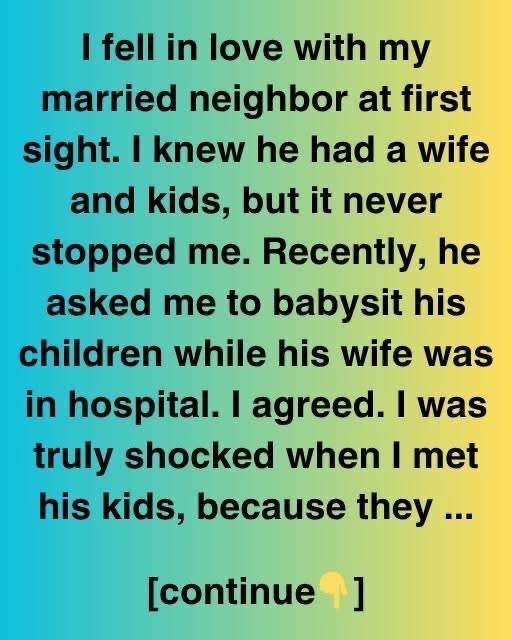 I fell in love with my married neighbor at first sight. I knew he had a wife and kids, but it never stopped me. Recently, he asked me to babysit his children while his wife was in hospital.