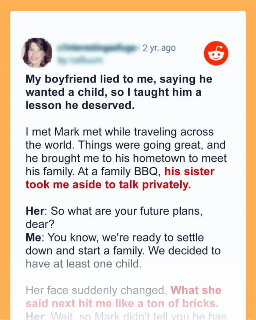 A young woman thought she met the man of her dreams only to discover he had lied about wanting to have a child with her. Instead of letting the truth break her, the woman devised a cunning plan that exposed his lies to his entire family. My name is Hailey.