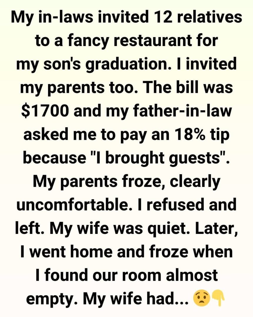 I tried to explain that, but my father-in-law just smirked. My wife avoided my eyes. So I stood up, said calmly, “No, I won’t pay a tip for being a son-in-law,” and walked out with my parents.