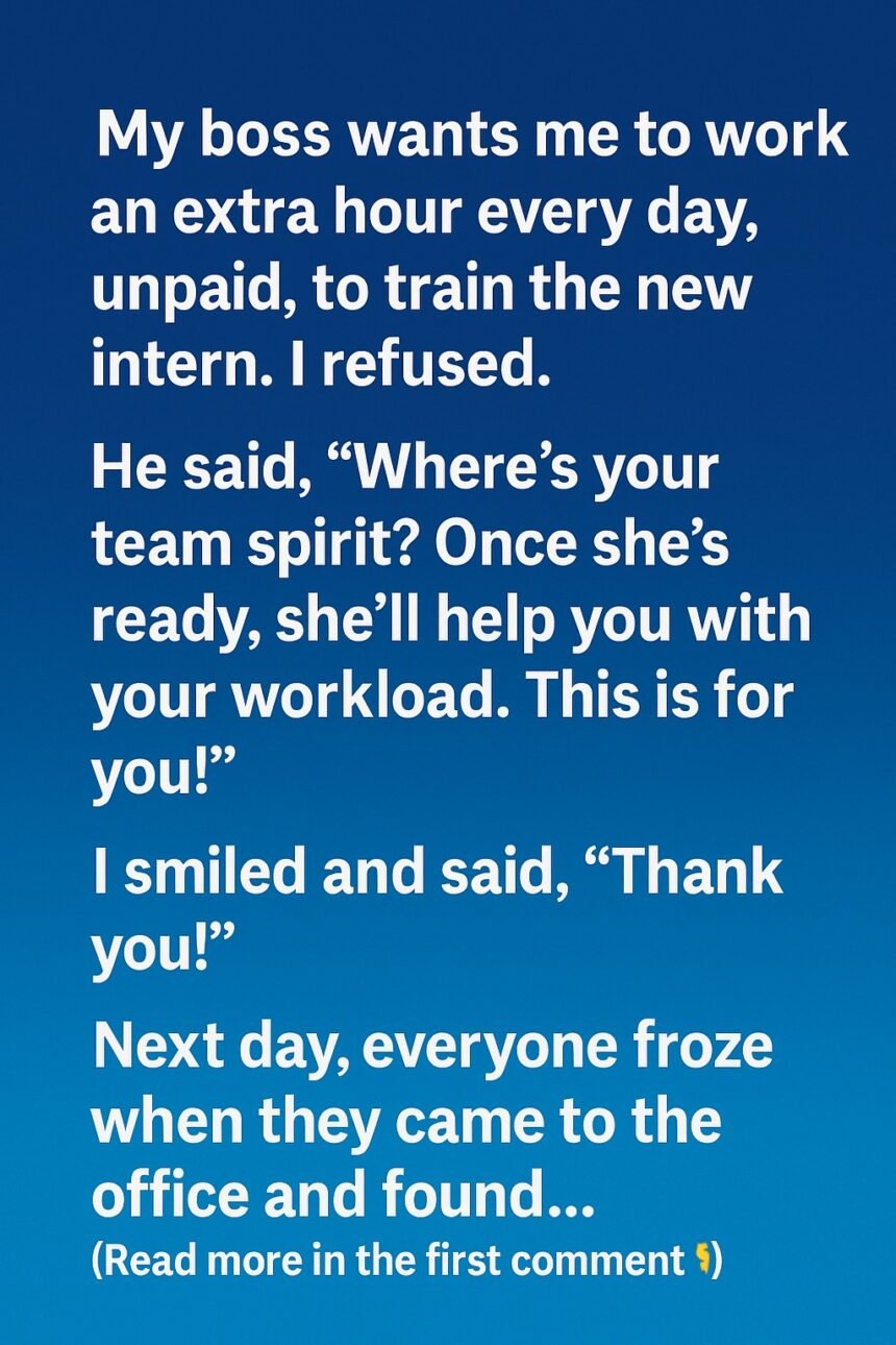 When my boss asked me to work an extra hour every day, unpaid, to train the new intern, I paused. I already stayed late, handled extra tasks, and had never asked for anything in return. I politely declined, explaining that my time outside work was important to me.