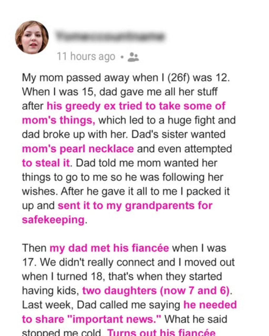 My dad ended things with her immediately and apologized. It wasn’t even the first time someone went after Mom’s things. My aunt, his sister, once tried to steal a pearl pendant that had been Mom’s favorite.