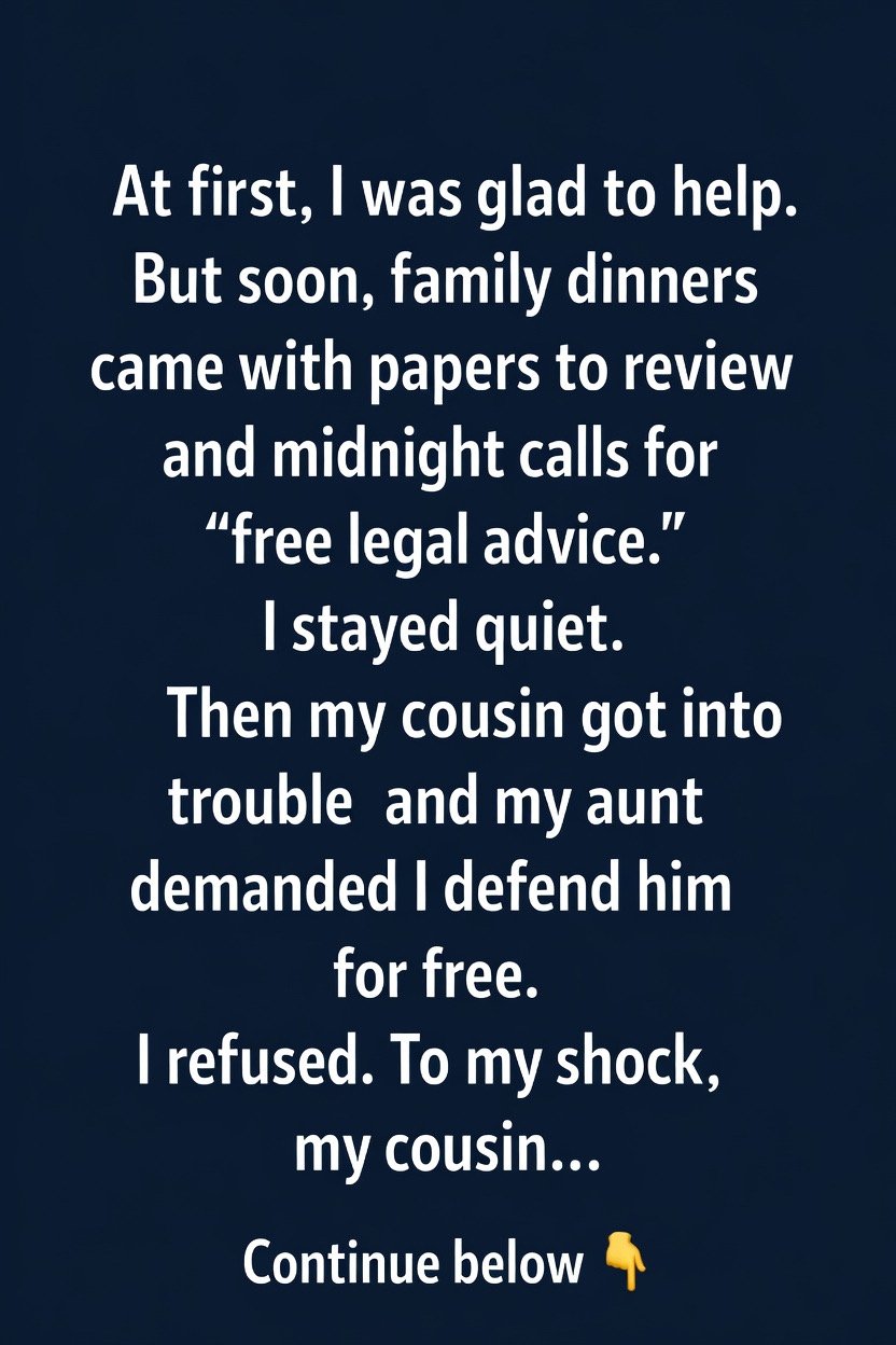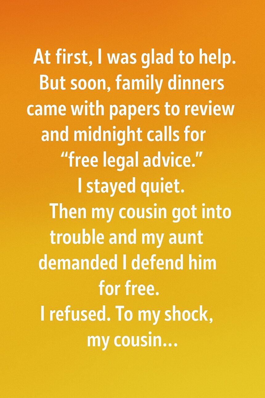 I stayed quiet, afraid of hurting anyone’s feelings.Then one day, my cousin got into serious legal trouble. My aunt called me, expecting me to represent him for free.