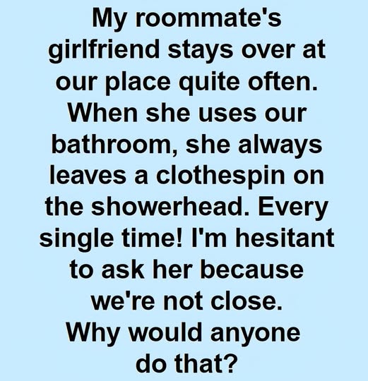 I live with a roommate, and his girlfriend stays over quite often. Every time she uses our bathroom, I notice something odd — she always leaves a clothespin clipped to the showerhead. At first, I brushed it off as just a quirky habit.